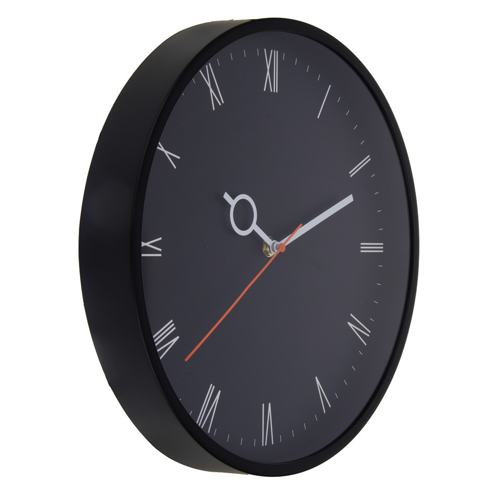 Часы настенные черного цвета – это стильный и практичный аксессуар для декорирования интерьера. Изготовлены из качественного пластика, обладают прочностью и долговечностью. Диаметр часов составляет 30 см, что позволяет хорошо видеть время даже с некоторого расстояния. Часы имеют яркий дизайн в черном цвете, который идеально дополнит любой интерьер. Стрелки с цифрами контрастируют с фоном циферблата, не мешая пользователям смотреть на время. Cекундная стрелка позволяет определить время с абсолютной точностью. Время обозначено в виде римских цифр. Часы оснащены тикающим механизмом, который добавит уюта и традиционного звука в ваш дом. Элемент питания – 1 батарейка АА-типа.