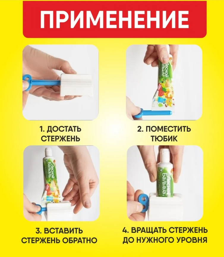 Устройство для бережного и эффективного использования зубной пасты (или тюбика крема, любой мази)– удобное и практичное приспособление для хранения и равномерного выдавливания зубной пасты, кремов, клея, гелей, мазей, горчицы. Одним словом, выдавливатель помогает выдавить любое содержимое из тюбиков и не оставить незамеченную часть пасты. Самое важное - это устройство поможет вам максимально использовать пасту и не выбросить её в мусорное ведро, если вдруг заметили что в тюбике ещё что-то осталось. Инструкция по применению: Вставьте тюбик с зубной пастой в ключик за самый тонкий край, затем поместите его в белую подставку. Поворачивайте ключик и паста будет выдавливаться. Можно также использовать для крема для рук и лица.