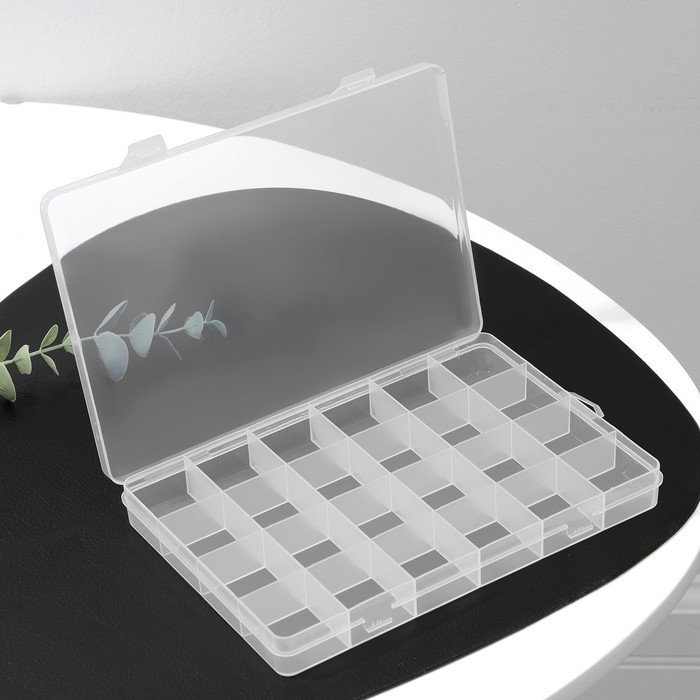 Пластиковый контейнер для мелочей имеет 24 индивидуальных отделений, в которых удобно хранить рыбацкие снасти, принадлежности для вышивки и шиться. Специальные замки-защелки обеспечивают плотное закрывание крышки, исключая потерю мелких вещей. Контейнер для мелочей изготовлен из прозрачного пластика. Идеально подходит для рыболовных снастей и приманок, а также мелких деталей или аксессуаров для шитья.