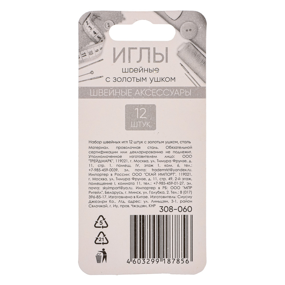 - Набор швейных игл 12шт с золотым ушком, сталь 308-060