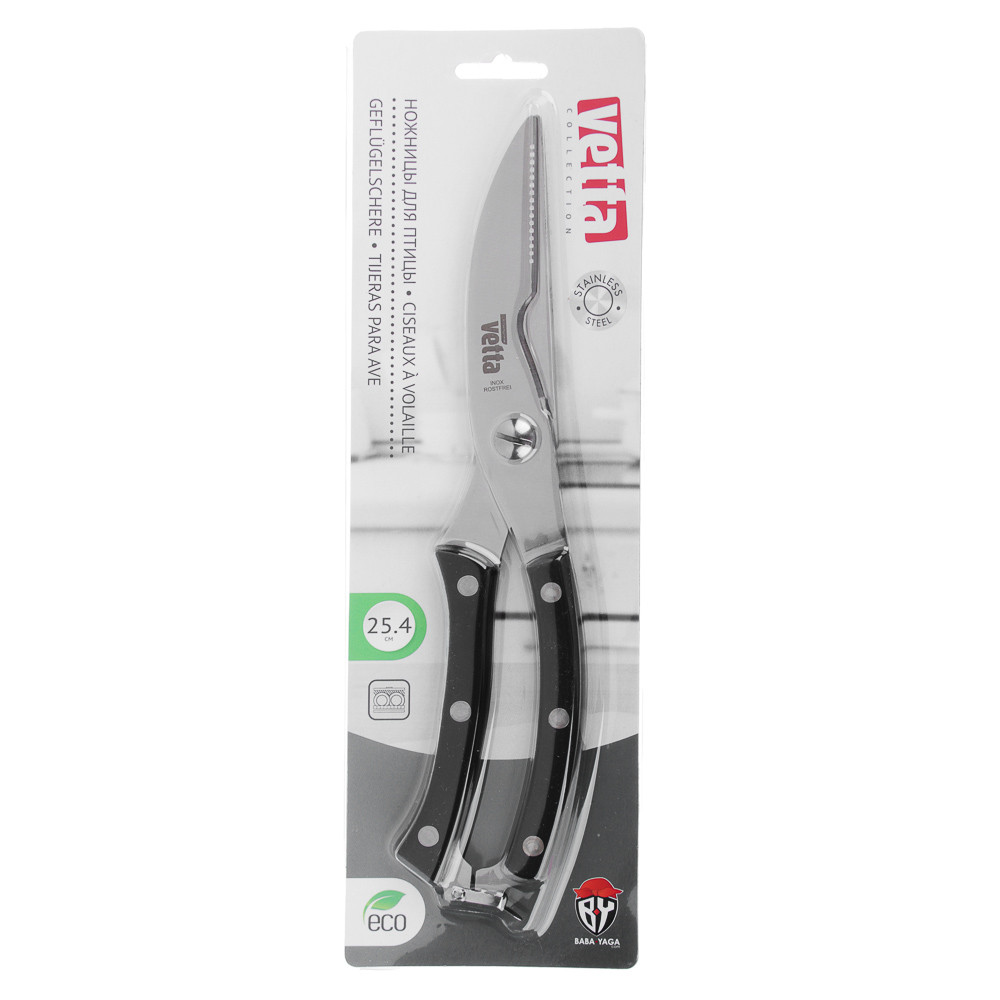 Универсальные кухонные ножницы VETTA всегда необходимы для разделки готовой курицы, вскрытия упаковок, чистки рыбы и др. Ножницы кухонные сделаны из высококачественного металла. Ножницы имеют надежное винтовое крепление.