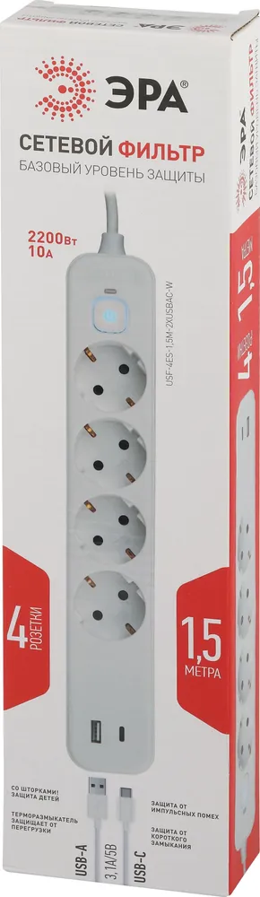 Сетевой фильтр 4 розетки+2 USB+C3, 1,5м, 10А Эра