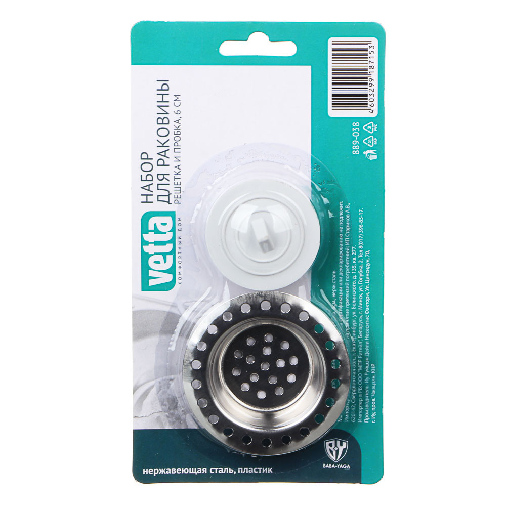 - Набор для раковины решетка и пробка, 6см, нерж.сталь, 889-038